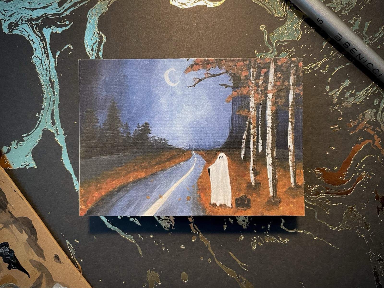 ACEO PRINT of Original Acrylic on Canvas Ghost Autumn Road Supernatural 2.5x3.5
