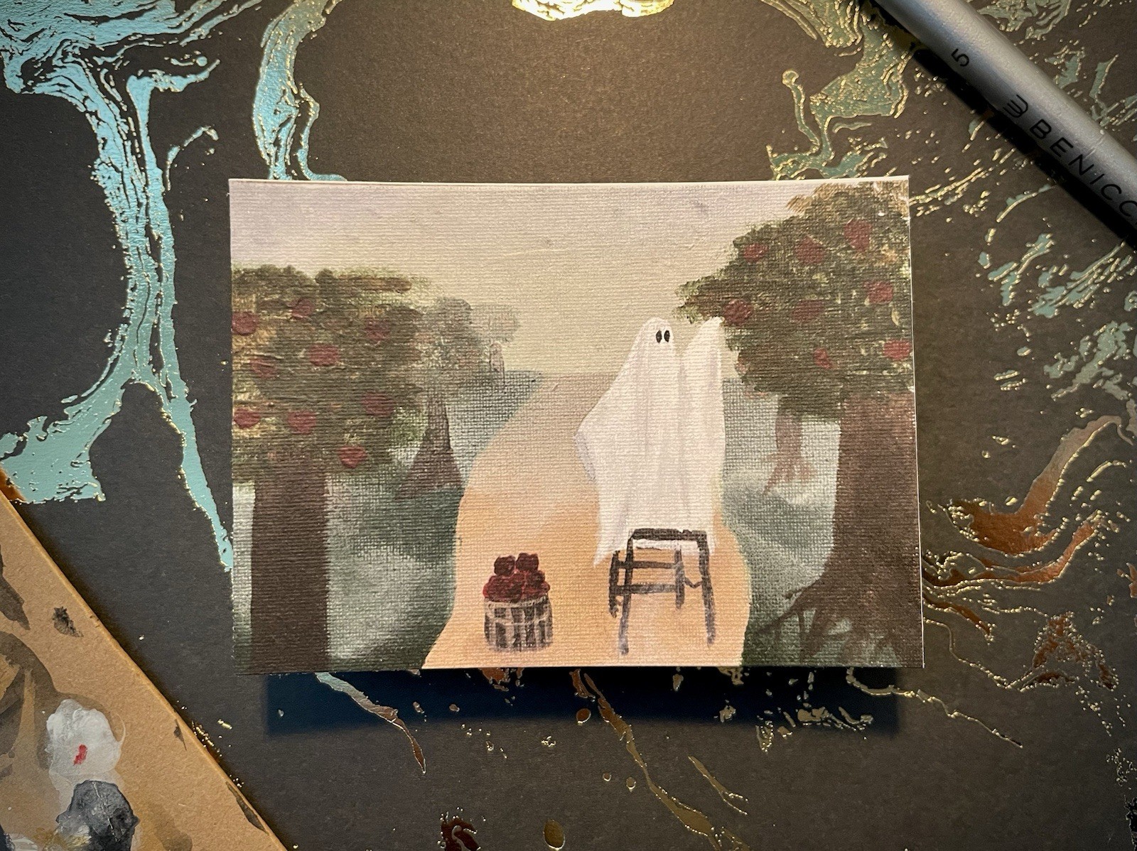ACEO PRINT of Orig. Acrylic on Canvas Ghost in Apple Orchard Halloween 2.5”x3.5”