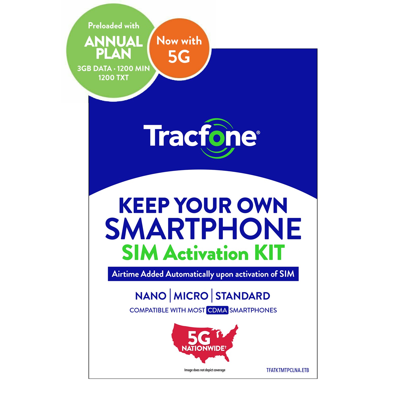 Tracfone Prepaid SIM + 1 year Plan 3GB Data,1200 Min,1200 Txt