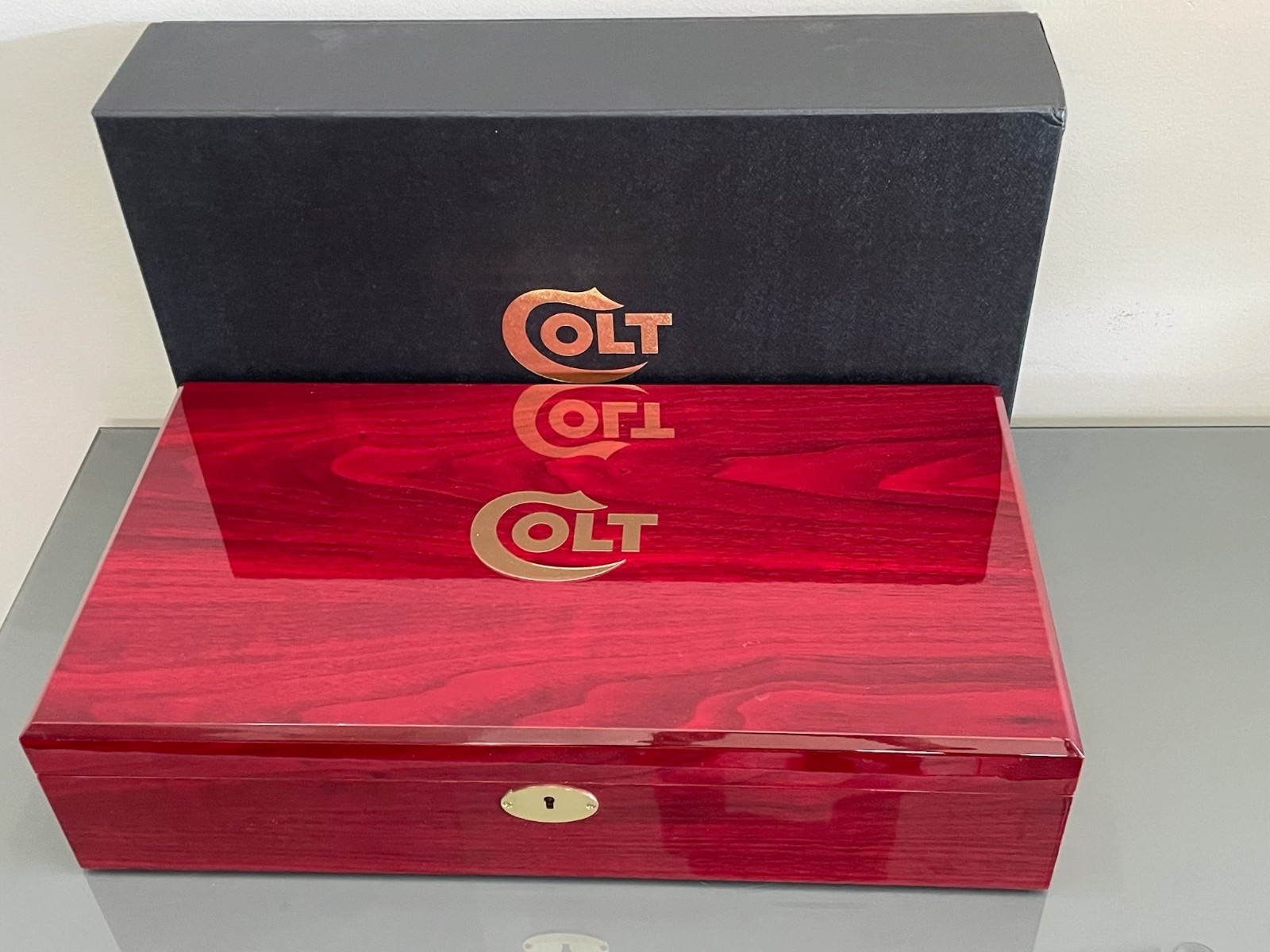 New Colt Presentation Box, cherry wood with gold accents and key